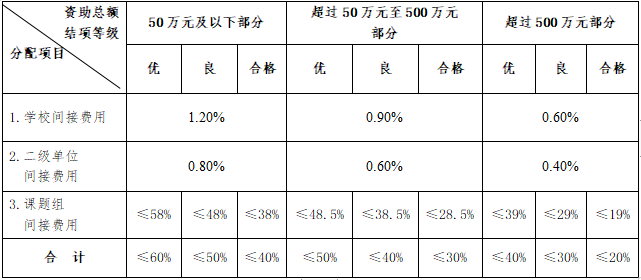 第十四条 间接费用的分配兼顾学校、二级单位和课题组三方利益,采用分段超额累退比例法进行分配。