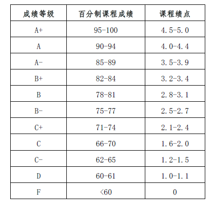 系统将根据百分制课程成绩自动生成课程绩点和成绩 等级,其对应关系如下: