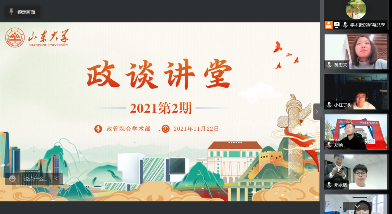 为了提高同学们参与社会实践的能力,丰富同学们的社会经历,11月22日晚,由政管学院学生会学术部主办的政谈讲堂第2期——“社会实践与调查报告撰写”主题讲座于线上成功举办。本次讲座邀请的主讲嘉宾为政管学院2020级硕士研究生郑涵,学术部路欣宇主持本次讲座。
