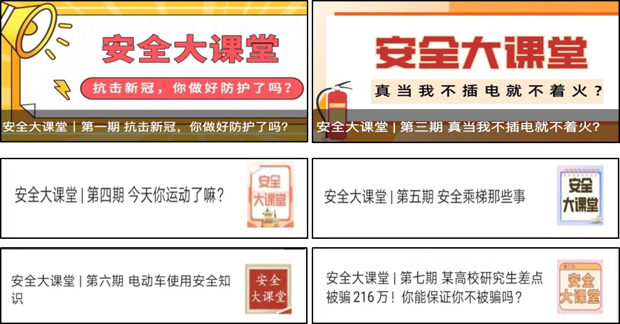 着眼于进一步加强平安校园建设,着力培育校园安全文化,政管学院积极发挥融媒体在网络思政中的独特作用,以学院研究生会公众号为主要阵地,开设了“安全大课堂”专栏。此专栏以践行总体国家安全观,加强校园安全防范意识为宗旨,借助新颖、活泼、生动的线上宣传形式,分别以新冠疫情安全防护、“双十一”网络电信诈骗、校园电动车使用安全、校园消防安全为主题,截至目前,共发布7期推文。“安全大课堂”系列推文以贴合高校校园实际生活的案例,形象地列举了常见的校园安全问题,培养了同学们自护自救的知识和技能,给同学们敲响了安全警钟。