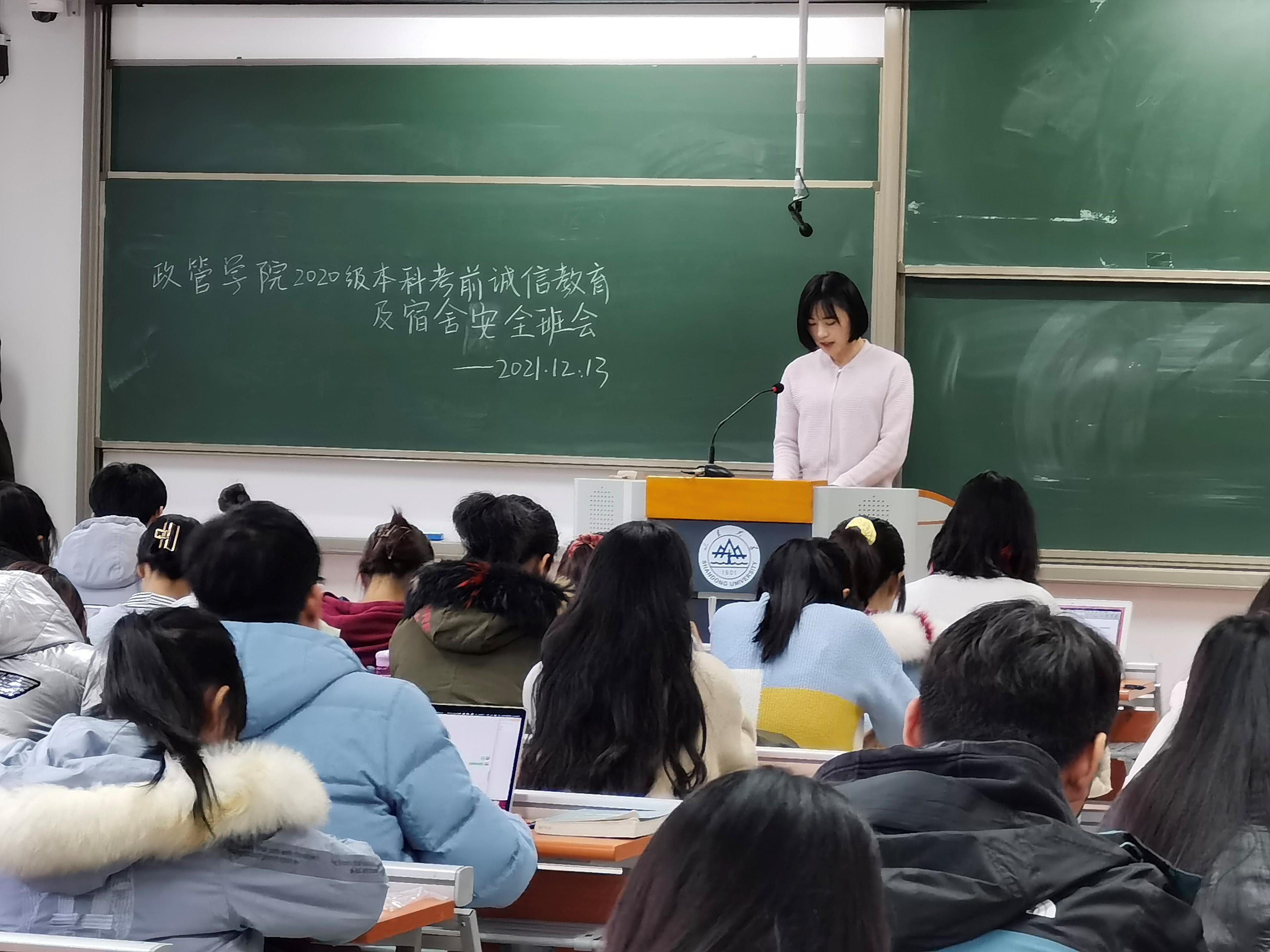为确保期末各项工作顺利开展,督促学生们认真投入期末复习,保持优良学风,提高学生诚信意识,12月13日,政管学院举办2020级本科开展考前诚信教育暨宿舍安全班会。班会由辅导员臧丽丽主持,政管学院2020级全体本科生参加。