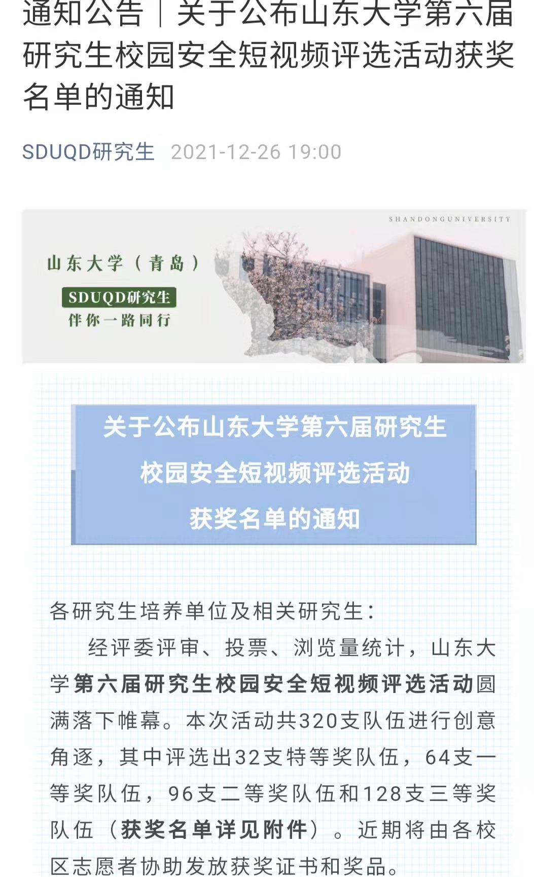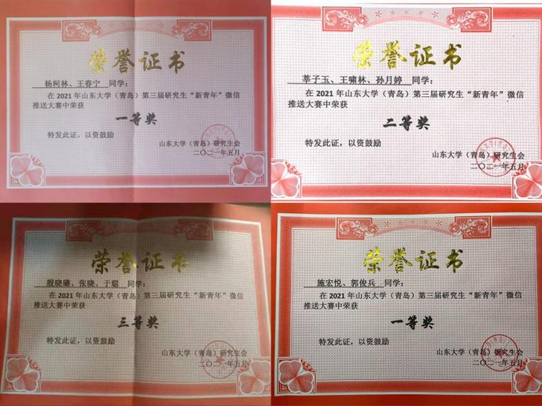 1、在304永利集团官网入口(青岛)第三届研究生“新青年”微信推送大赛中,我院杨柯林和施宏悦两个团队获一等奖,莘子玉团队获二等奖,殷晓璐团队获三等奖;