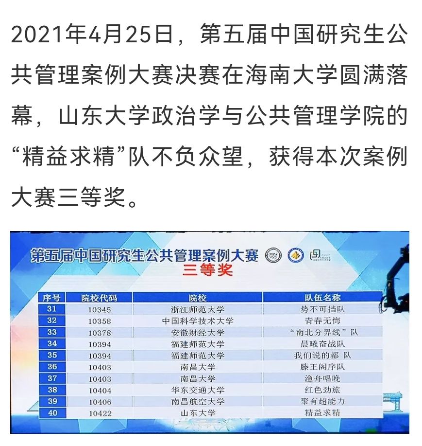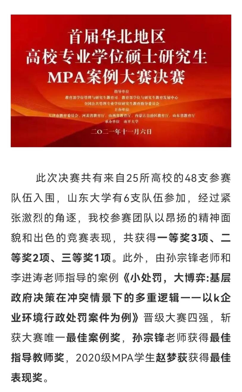 3、在首届华北地区高校专业学位硕士研究生MPA案例大赛,政管学院代表队伍获得一等奖3项,二等奖2项和三等奖1项;