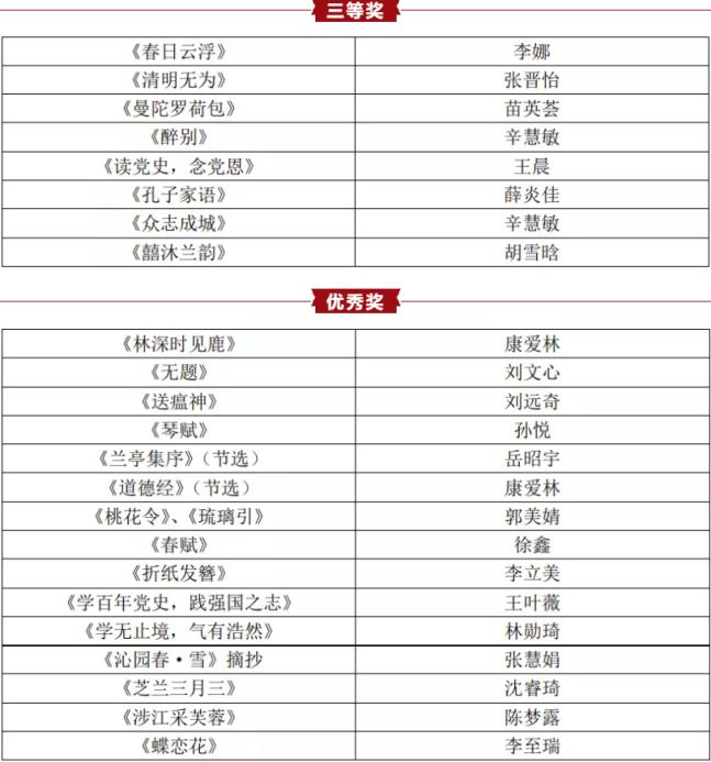 4、在304永利集团官网入口第四届“百年华诞,向党献礼”研究生线上书法大赛中,我院苗英荟同学获二等奖,孟雪迪、刘亚静同学获三等奖;在304永利集团官网入口第六届研究生校园安全短视频评选活动中,我院获一等奖、二等奖团队各1支,共有21支团队获三等奖;