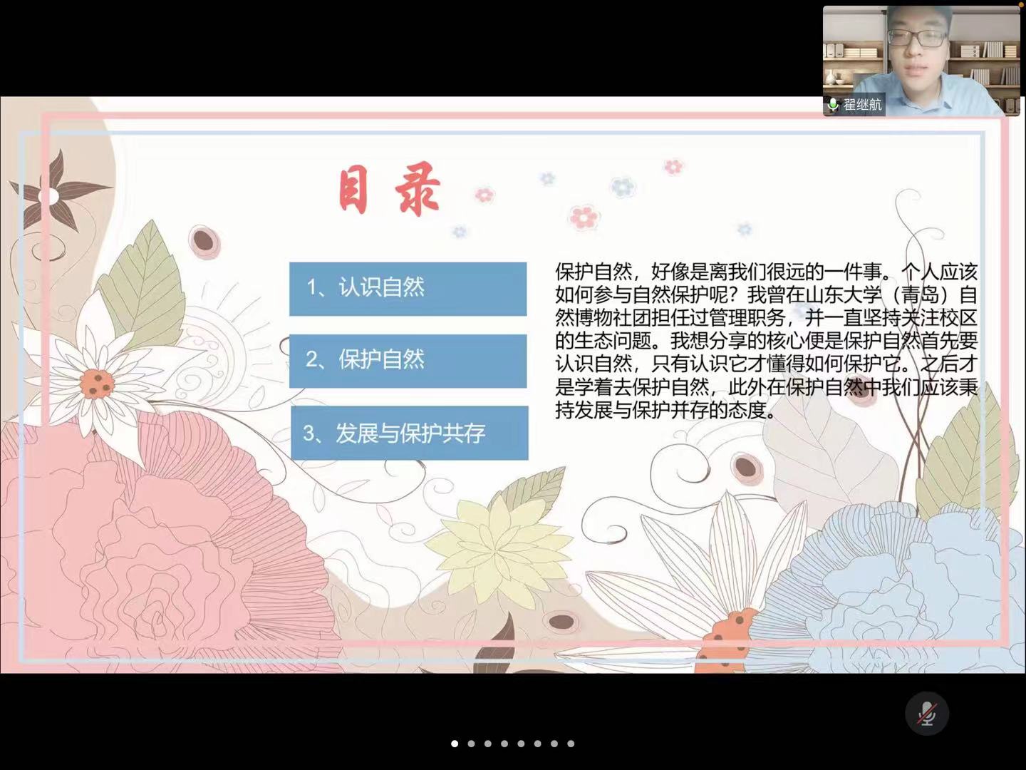 翟继航同学首先为大家进行了分享。他指出,保护自然首先要认识自然,了解与自己休戚相关的自然界,只有认识它才能够懂得如何保护它。他还以校园北区开发为例强调了采取适当手段保护自然的重要性。