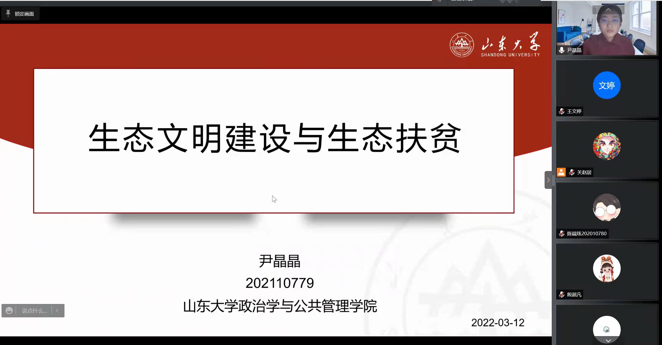 随后,尹晶晶同学以习近平总书记关于生态文明的一系列新思想、新论断和新要求为切入点,阐述了生态文明建设思想产生的背景,进而对相关概念进行了解释,并结合生态脱贫的实践案例指出了生态文明建设的重要价值和指导意义。