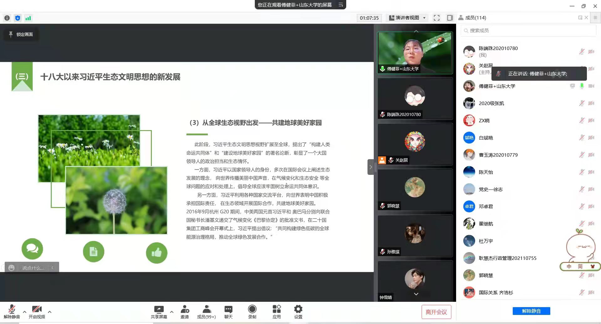 傅健菲同学为大家介绍了习近平生态文明思想的理论内涵、思想演进的基本规律及其理论价值和实践意义,以帮助大家深刻理解习近平生态文明思想。