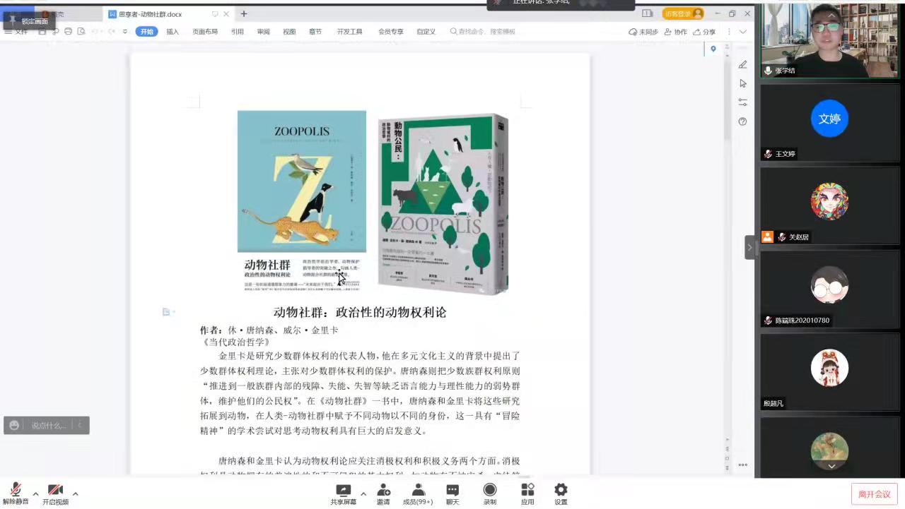 张学结同学介绍了休·唐纳森和威尔·金里卡关于“人类与动物的关系”的观点。他从“社群”的概念出发,将公民身份的框架应用于动物权利问题,并由此思考不同的“人类-动物关系”所衍生的不同类型的义务,以期重新构建人类与动物的关系,推动动物权利的发展。