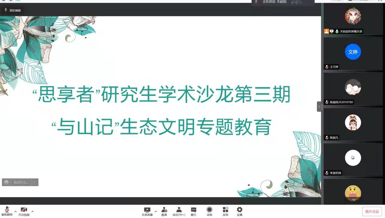 本期思享者”研究生学术沙龙在轻松愉悦的氛围中帮助大家学习到生态文明知识,会后同学们激情澎湃,通过小程序打卡的方式分享了自己的心得体会。本次生态文明专题教育活动在植树节当日举行,围绕绿色环保、生态文明等主题进行互动交流,为学院研究生提供了一次深入学习生态文明相关知识的机会,极大地鼓励了学院研究生从多角度认识和理解绿色发展,养成低碳环保的生活习惯,在思考与实践中贯彻尊重自然、顺应自然、保护自然的生态文明理念。