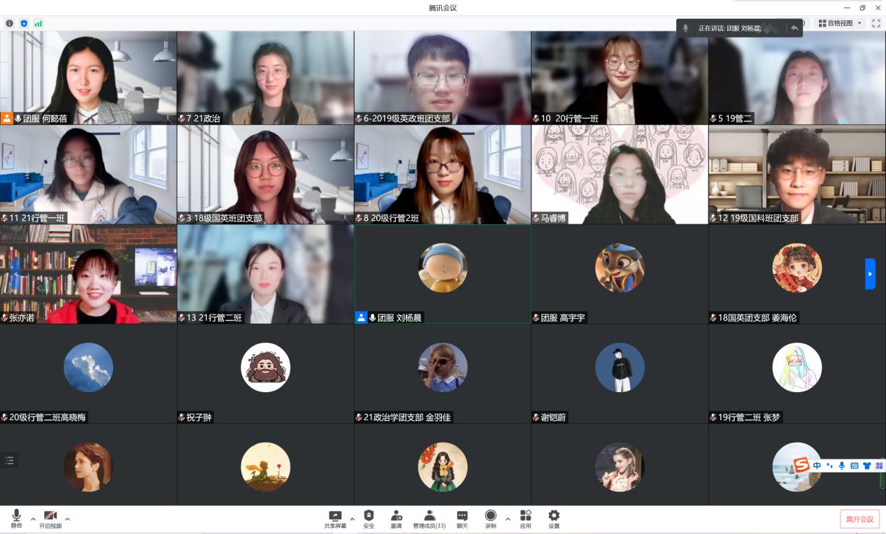 为切实加强学院学生团支部的组织建设,全面活跃团支部工作,增强团支部凝聚力和战斗力,按照校团委通知要求,政管学院团委继续深入开展2022年度团支部“达标升级”工作,于3月16日晚以线上会议形式开展本年度团支部“达标升级”答辩会。政管学院党委副书记马桂兰,学院本科生导师程龙、俞少宾,学院团委书记于玲,本科生辅导员臧丽丽、祝子翀、张弘扬出席。答辩会由院学生会团支部服务中心负责人何懿蓓主持。