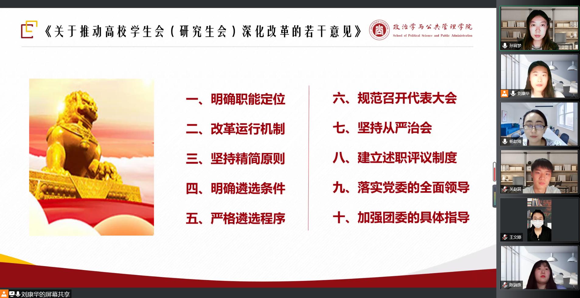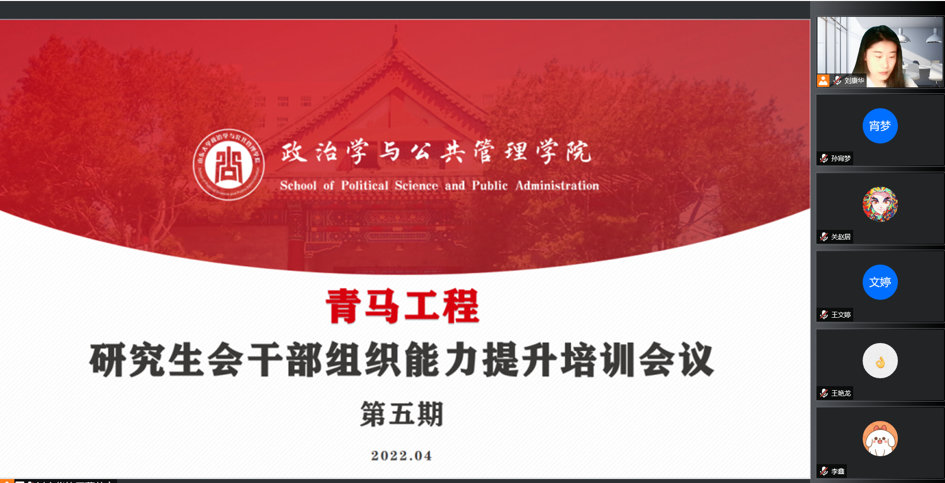 为加强研究生会成员思想建设,提高研究生会整体服务能力,营造风清气正的组织氛围,以更好的面貌迎接共青团成立100周年。4月19日晚,政管学院研究生会于腾讯会议线上召开了青马工程之研究生会干部组织能力提升培训会议第五期,第十七届研究生会全体成员参加。