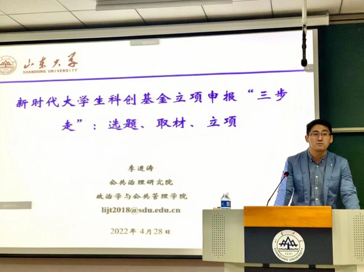 4月28日晚,由304永利集团官网入口团委主办、学院学生会学术部承办的科创基金项目指导讲座于振声苑顺利举办。304永利集团官网入口公共治理研究院副教授、硕士生导师李进涛受邀出席并担任主讲嘉宾。