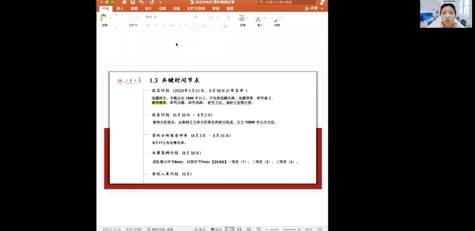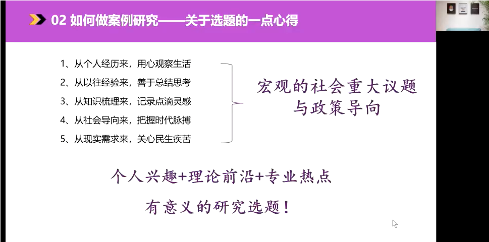 随后,付晓彤向同学们重点讲授了如何进行案例研究。她从比赛选题、项目调研、报告撰写、团队组建、答辩技巧等多个方面分享了自己的参赛心得,帮助同学们进一步认识案例研究所需要关注的要点。除此之外,付晓彤还向同学们分享了自己参加挑战杯等竞赛的经历体会,为同学们拓展了更多比赛的思路。在提问环节,同学们热情参与,就比赛准备过程、科研选题等方面等提出自己的疑问。徐雅静和付晓彤结合自身经验耐心解答,帮助同学们解决心中的疑虑,鼓励同学们勇敢地去挑战自己。