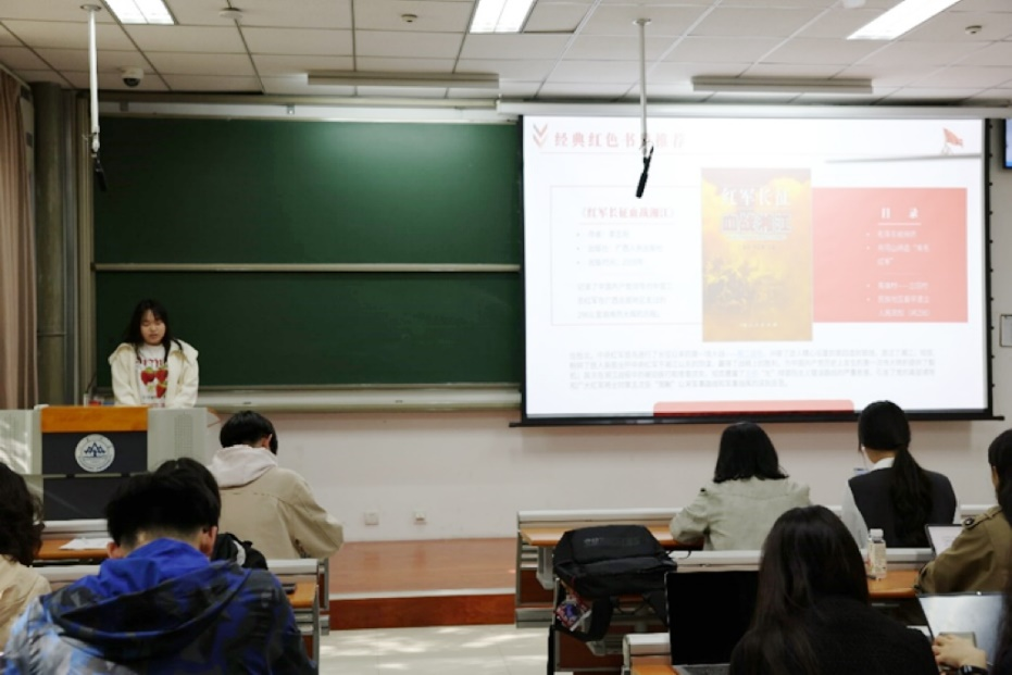 活动伊始,团支书宋怡向全体同学推荐《红军长征 血战湘江》一书。她从湘江战役的战略背景切入,详细梳理了红军突破国民党第四道封锁线的悲壮历程,重点解析了战役中“勇于胜利、勇于突破、勇于牺牲”的精神内核。“这本书不仅是历史记录,更是一本‘精神教科书’,让我们看见革命先辈用生命诠释的信仰力量。”
