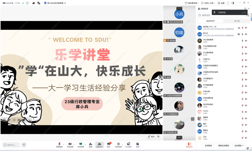 8月17日,政管学院学生会主席团成员、国家奖学金得主、2023级行政管理专业本科生库小兵同学围绕学业发展、选课机制、信息资源工具利用、校园活动与社会实践参与等主题,与新同学们进行了深入交流。旨在帮助新生在未来四年中更好地平衡学习、兴趣与学生工作,实现综合素养的全面提升。