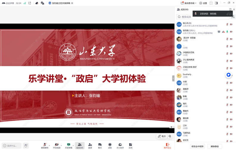 8月16日,政管学院学生会执行主席、2023级行政管理专业本科生张钧瑜以“山大乐相融”为主题,首先为新生讲解了报到注意事项及军训相关事宜,随后详细介绍了在青岛校区衣、食、住、行等方面的生活指南。细致入微的讲解帮助新同学更加从容地迎接大学新生活。
