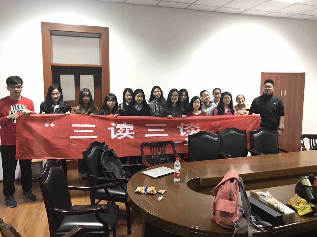 15行管班本学期开展“三读三谈”系列活动,包括“读专业著作、读文史经典、读习近平总书记系列重要讲话和谈生活趣事、谈人生体验、谈时政热点”,以此机会增加同学们的阅读量,拓展知识面,增进同学联系,活动开展以来受到同学们的热情参与和广泛好评。