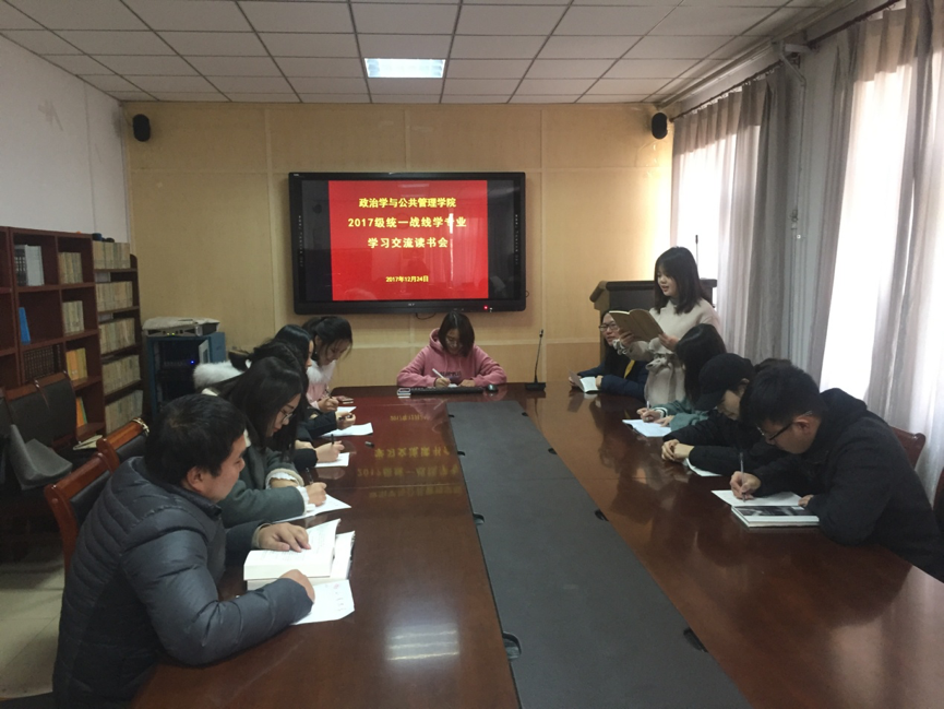近日,304永利集团官网入口政管学院2017级统战硕士班在院楼224举办了学习交流读书会。本次活动分为两个部分:第一部分为全班共同交流《中国共产党统一战线工作条例(试行)》学习心得,第二部分为同学之间相互推荐近期阅读的好书并分享推荐理由。在场同学互动积极,发言踊跃,学习气氛热烈。