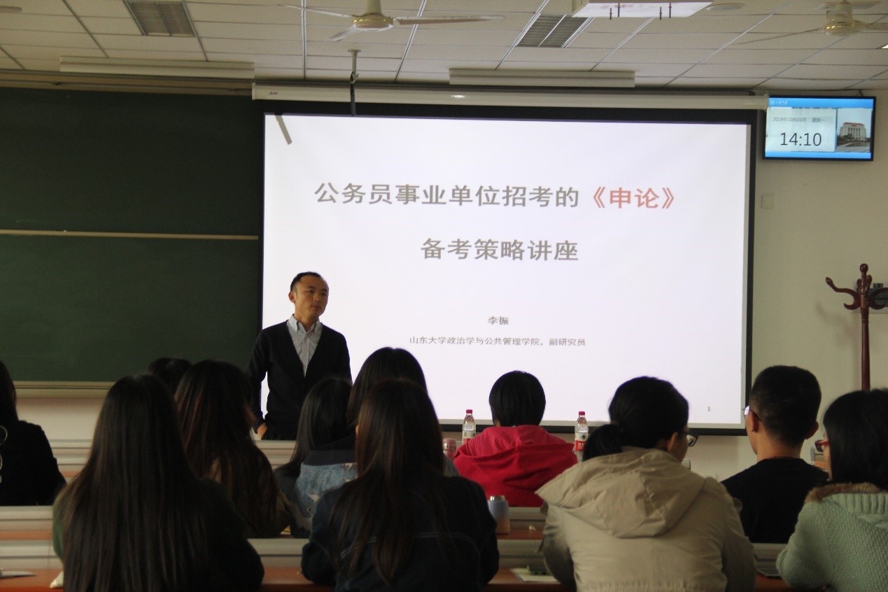 为提高同学们的《申论》写作水平,使同学们掌握有效的写作技巧,10月21日下午,政管学院在振声苑S306教室举办公务员事业单位《申论》备考策略讲座。本次讲座由政管学院、展翼助翔工作室主办,政管学院研究生会承办。讲座特邀政管学院副研究员李振老师担任主讲人,对公务员事业单位《申论》备考策略进行分析与讲解。