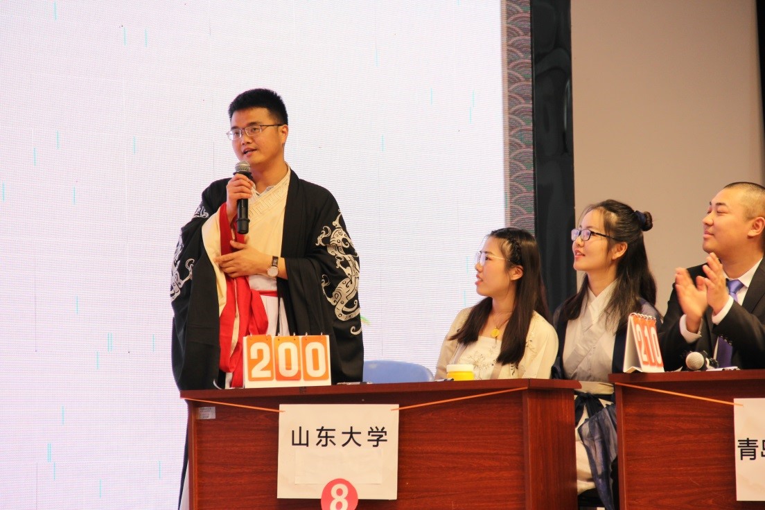 在选手答题的“小试牛刀”、“争分夺秒”、“合纵连横”三个环节中,我校代表队对汉字、古典诗词、传统艺术等题目做出了正确解答,展示了扎实的国学功底,为夺冠奠定了基础。经过“观众互动”、“险中求胜”等环节的比拼,我校代表队与青岛农业大学代表队比分持平。经过两轮加时赛的激烈角逐,山大代表队最终高分胜出,荣获国学知识竞赛决赛第一名。“校际争霸”才艺展示环节中,我校代表队围绕“爱国”这一主题,把中华优秀传统文化融入到了舞蹈、朗诵、流行乐等现代表演形式中,传统与现代的精彩结合赢得现场阵阵掌声。