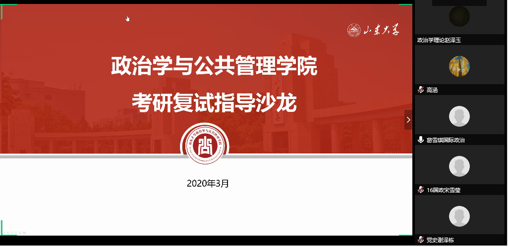 3月21日晚,政管学院通过腾讯会议平台,举行了2016级考研复试线上指导沙龙。四名来自不同专业的研究生代表和十余名进入考研复试环节的16级学生参与活动。此次沙龙由毕业年级兼职辅导员石鲁伟主持。