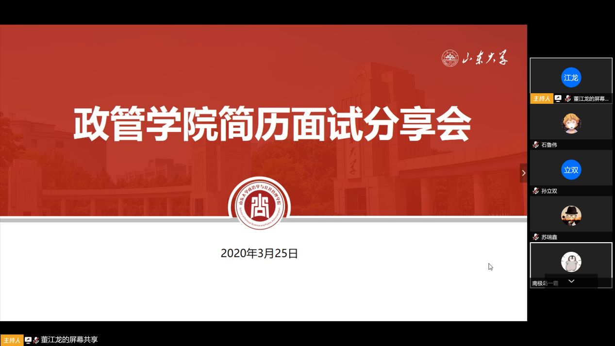 为了加强毕业生的求职技巧,提升学生的职业规划意识,3月25日晚,学院通过线上平台举办了简历面试经验分享会,邀请了4位资深从事人力资源工作的优秀校友作为主讲嘉宾。此次分享会由本科生兼职辅导员董江龙主持,学院本科年级30余名同学参与活动。