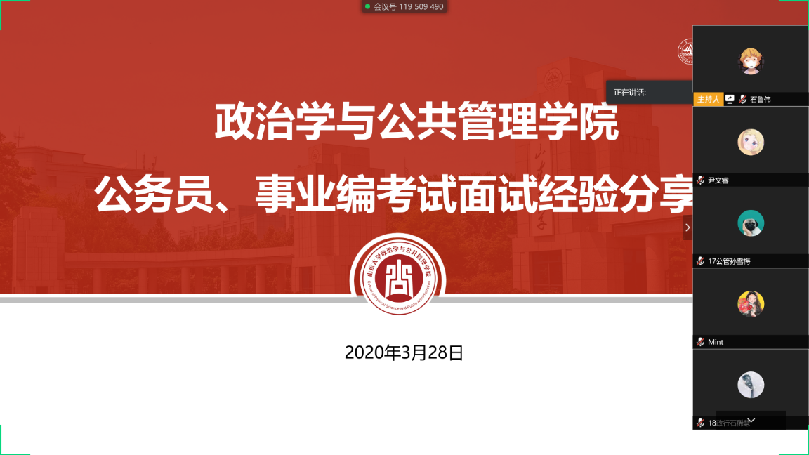 为帮助学院学生更好地认清当前的公务员、事业编招考形势,进一步提高复习备考效率,3月28日晚,政管学院通过腾讯会议线上举办公务员、事业编考试面试经验分享会。活动邀请到学院2017届毕业生李硕同学和2018届毕业生陈静文同学作为嘉宾。此次分享会由本科兼职辅导员石鲁伟主持,吸引了学院60余名本科生参加。