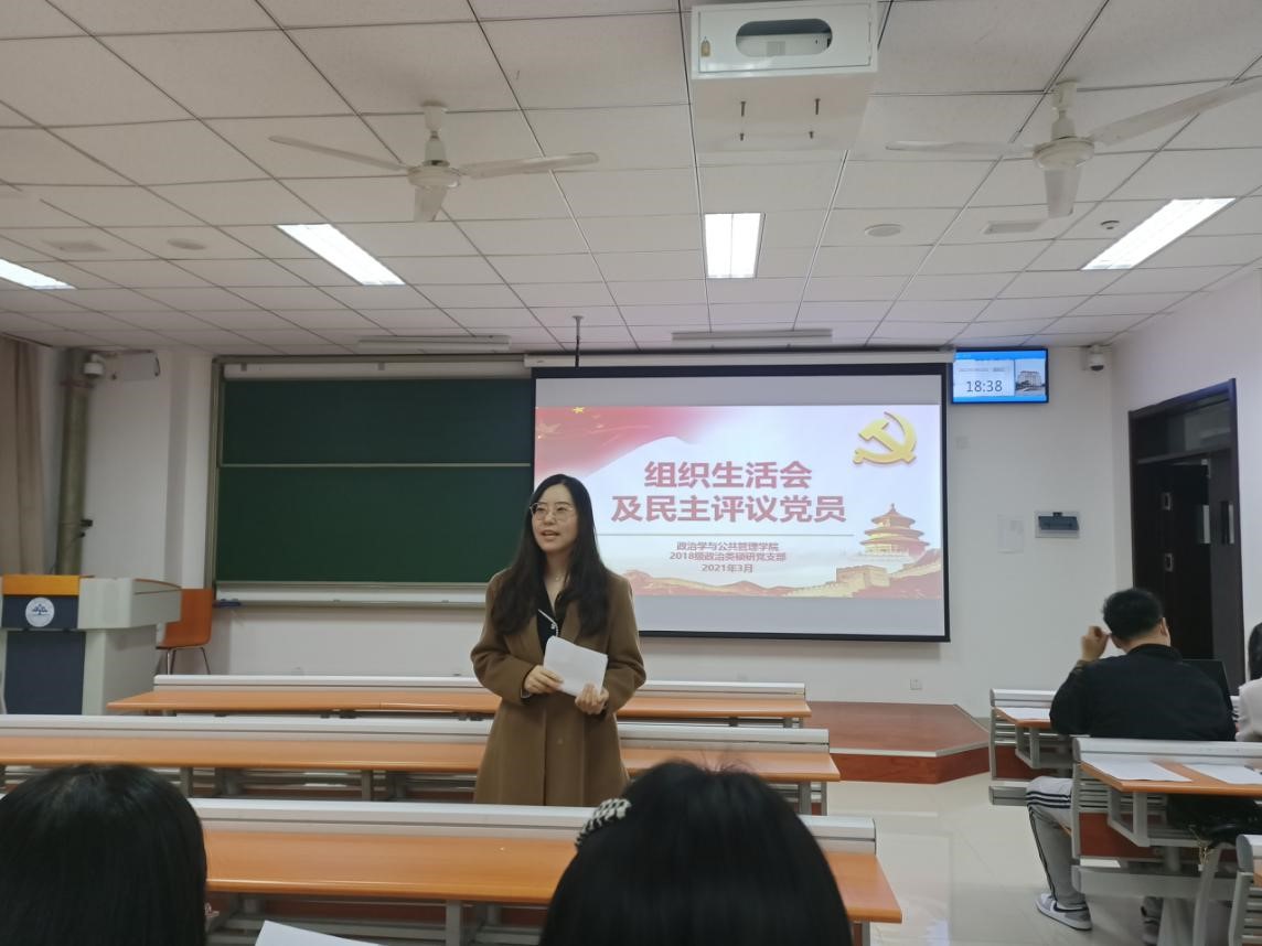 为贯彻落实政管学院党委部署和要求,凝心聚力,塑造良好的支部精神风貌,政管学院2018级政治类硕研党支部于3月12日晚在振声苑S206召开了2020年度组织生活会暨民主评议党员大会。会议由党支部书记孙艺鹏主持,2018级政治类硕研党支部全体党员参加,学院党委委员、辅导员李汉烨老师列席会议。