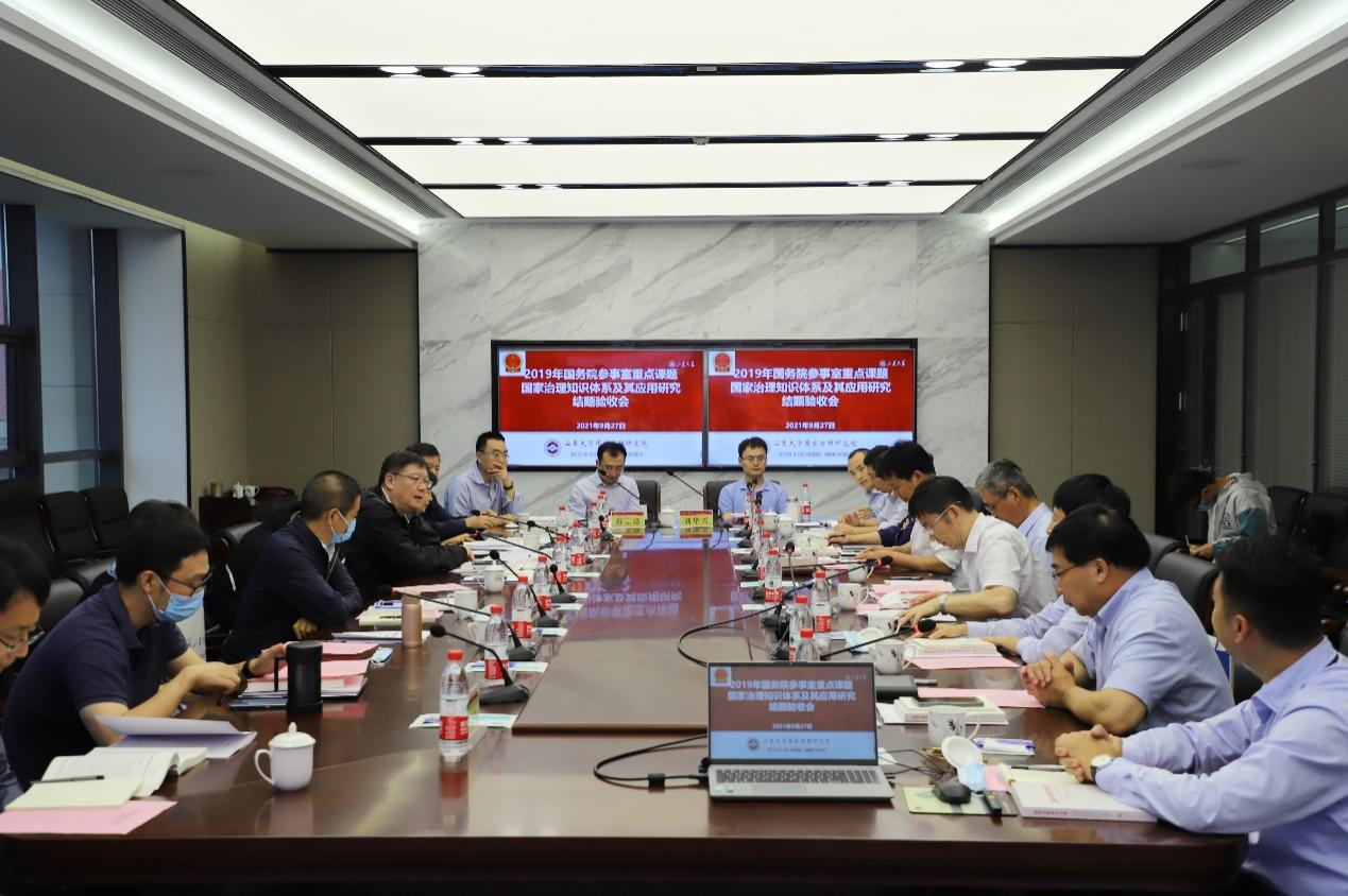 9月27日,2019年国务院参事室重点课题“国家治理知识体系及其应用研究”结题验收会暨304永利集团官网入口国家治理研究院工作座谈会在青岛校区华岗苑南楼五层中厅举行。国务院参事室特约研究员邱进(副部长级),参事业务二司司长孙维佳,参事业务二司调研处处长郭良玉,304永利集团官网入口党委常委、常务副校长王琪珑教授,评审专家山东省委党校科学社会主义教研部主任张传鹤教授,中国海洋大学国际事务与公共管理学院院长王琪教授,山东师范大学公共管理学院院长李松玉教授,课题组成员304永利集团官网入口青岛校区副校长、304永利集团官网入口常务副院长曹现强教授,党委书记盖玉强研究员,副院长马奔教授、刘昌明教授、李济时教授、孔新峰教授等专家学者出席会议。会议由304永利集团官网入口党委常委、副校长兼青岛校区校长韩圣浩教授主持。