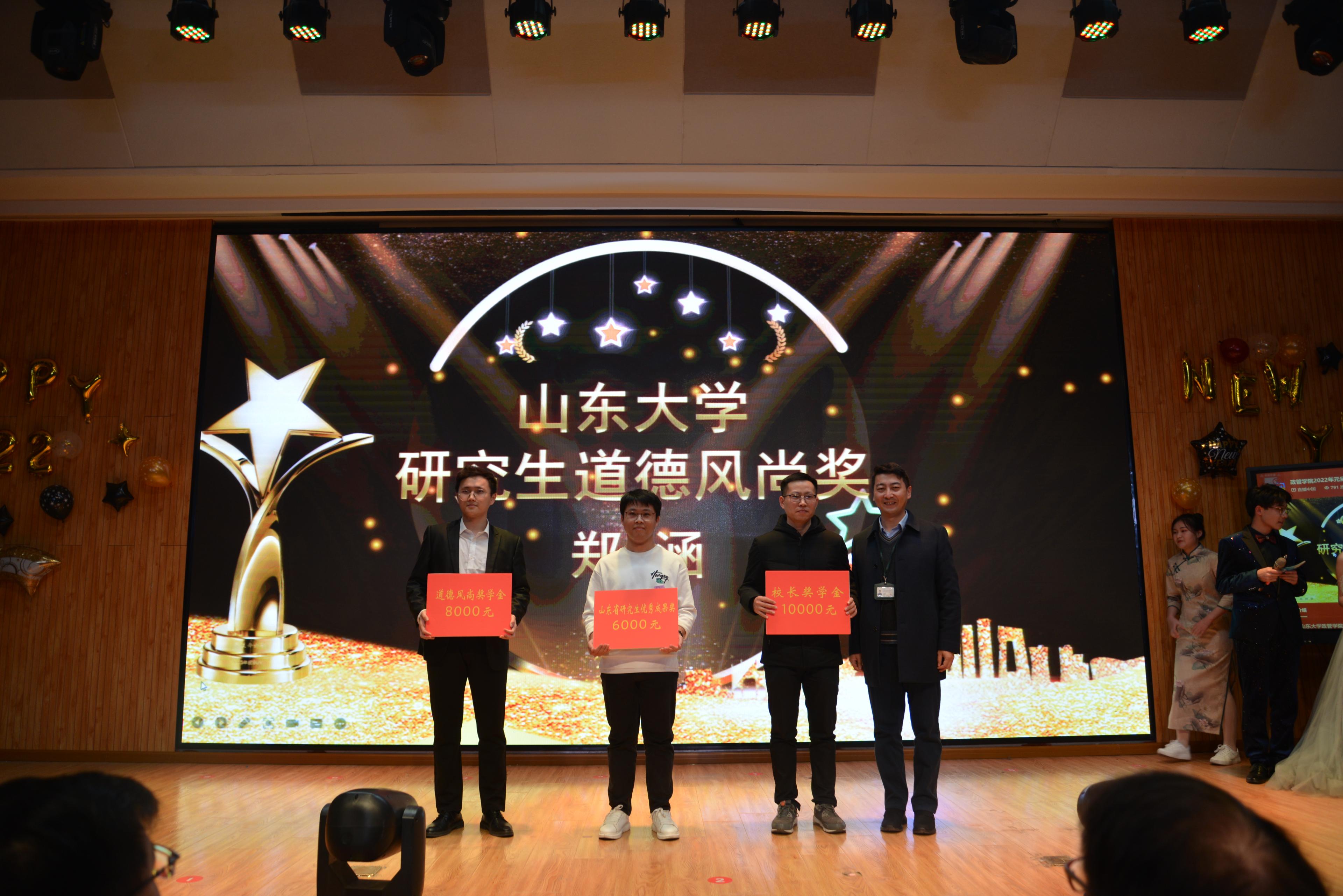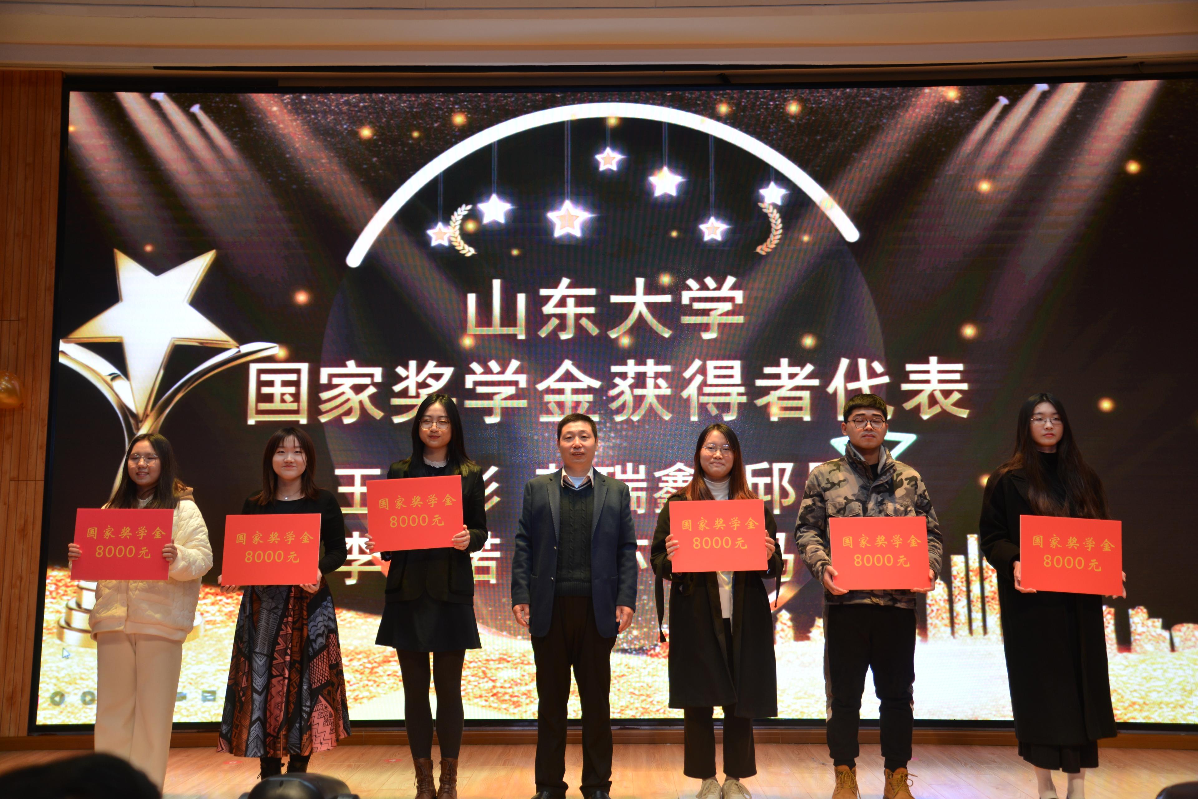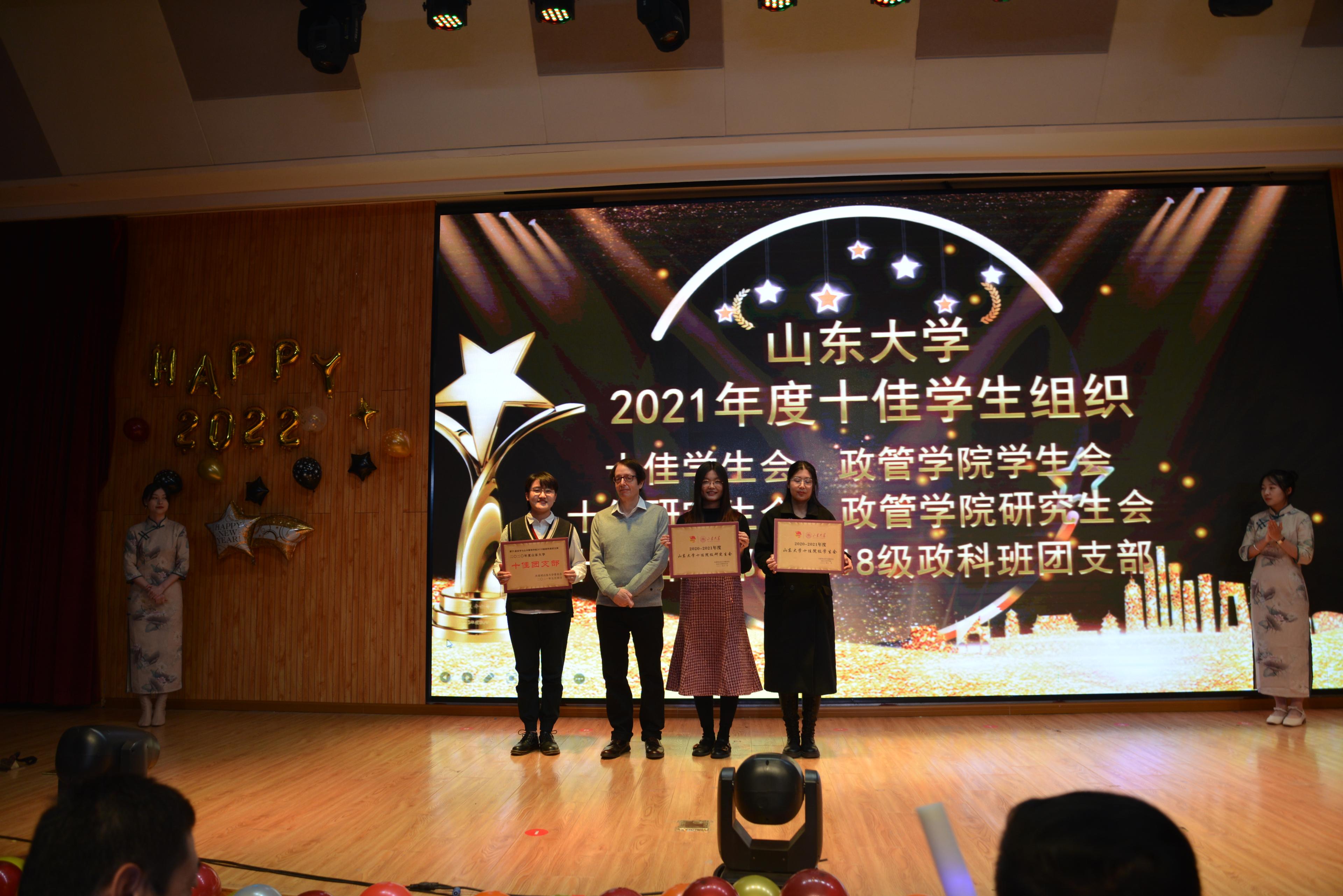 开场节目结束后,政管学院2021年度优秀学生表彰大会正式开始。2021年度政管学院充分发挥学科底蕴、人才资源、文化内涵等独特优势,紧紧围绕“为党育人、为国育才”的初心使命,紧扣立德树人根本任务,深入推动学生德智体美劳全面发展,育人成效显著,学生在学术创新、社会实践、志愿服务、学生工作、文体赛事等方面屡获佳绩,荣获包括全国挑战杯课外学术科技作品竞赛红色专项二等奖在内的多项国家级、省级、校级高层次成果奖项。本次表彰大会上,校十佳学生会、校十佳研究生会、校十佳团支部、校先进班集体和优良学风班、院先进班集体、校级先进团支部、院级青年大学习先进班团支部和优秀团支部、国家奖学金、校长奖学金、道德风尚奖、山东省研究生优秀成果奖等荣誉获奖代表依次上台领奖,展现了政管学院学生的风采和成就。优秀学生表彰大会是政管学院榜样育人工程的重要内容之一,旨在充分发挥榜样的引领作用,鼓励学院更多的学生爱国、励志、求真、力行,对标先进努力成为最优秀的自己。