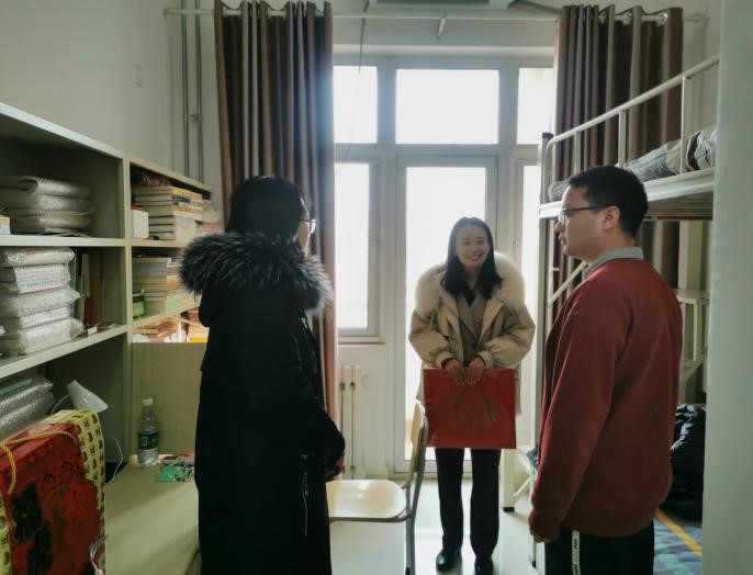 1月31日上午,正值除夕佳节,304永利集团官网入口副院长赵婷、辅导员于玲走进学生宿舍,看望寒假留校学生,转达学校、学院对留校学生的关怀,深入了解同学们在学习、科研与寒假生活等方面的情况,并代表学院送上新春祝福与节日礼包。