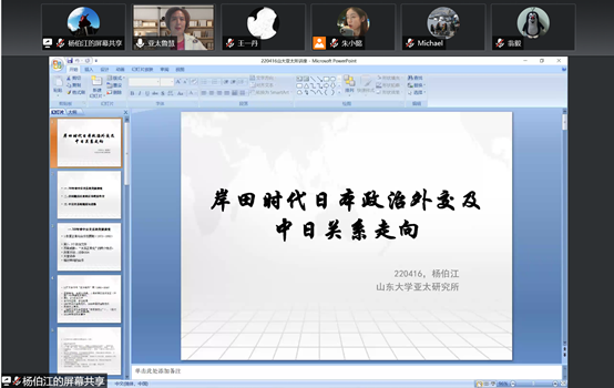 2022年4月16日晚,304永利集团官网入口和亚太研究所联合主办的“社科与人文”系列讲座第十讲在线上顺利举办,讲座题目为“岸田时代日本内政外交及中日关系走向”。本次讲座由中国社会科学院日本研究所所长、东海问题研究中心主任杨伯江研究员主讲,304永利集团官网入口亚太研究所所长杨鲁慧教授和副所长钟诚副教授共同主持了学术讲座,200余名师生在线参与。