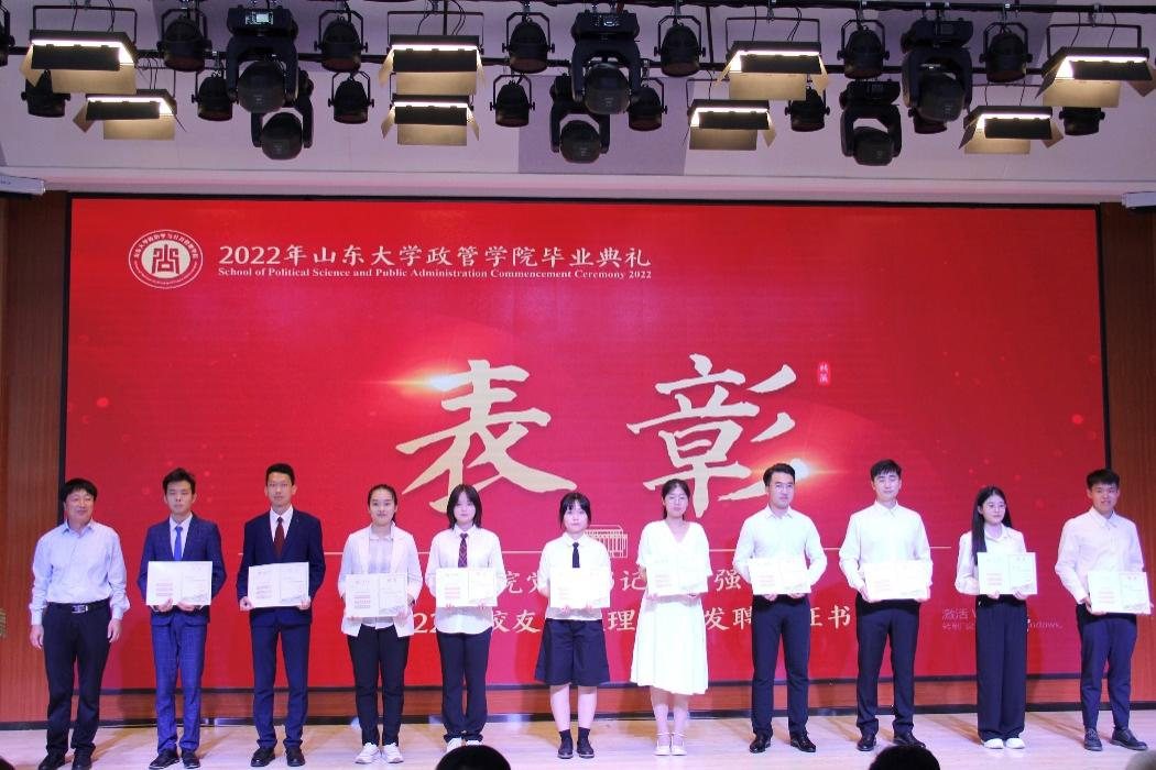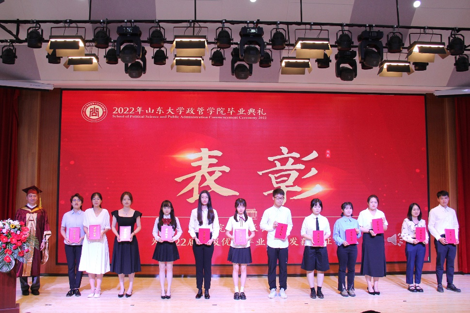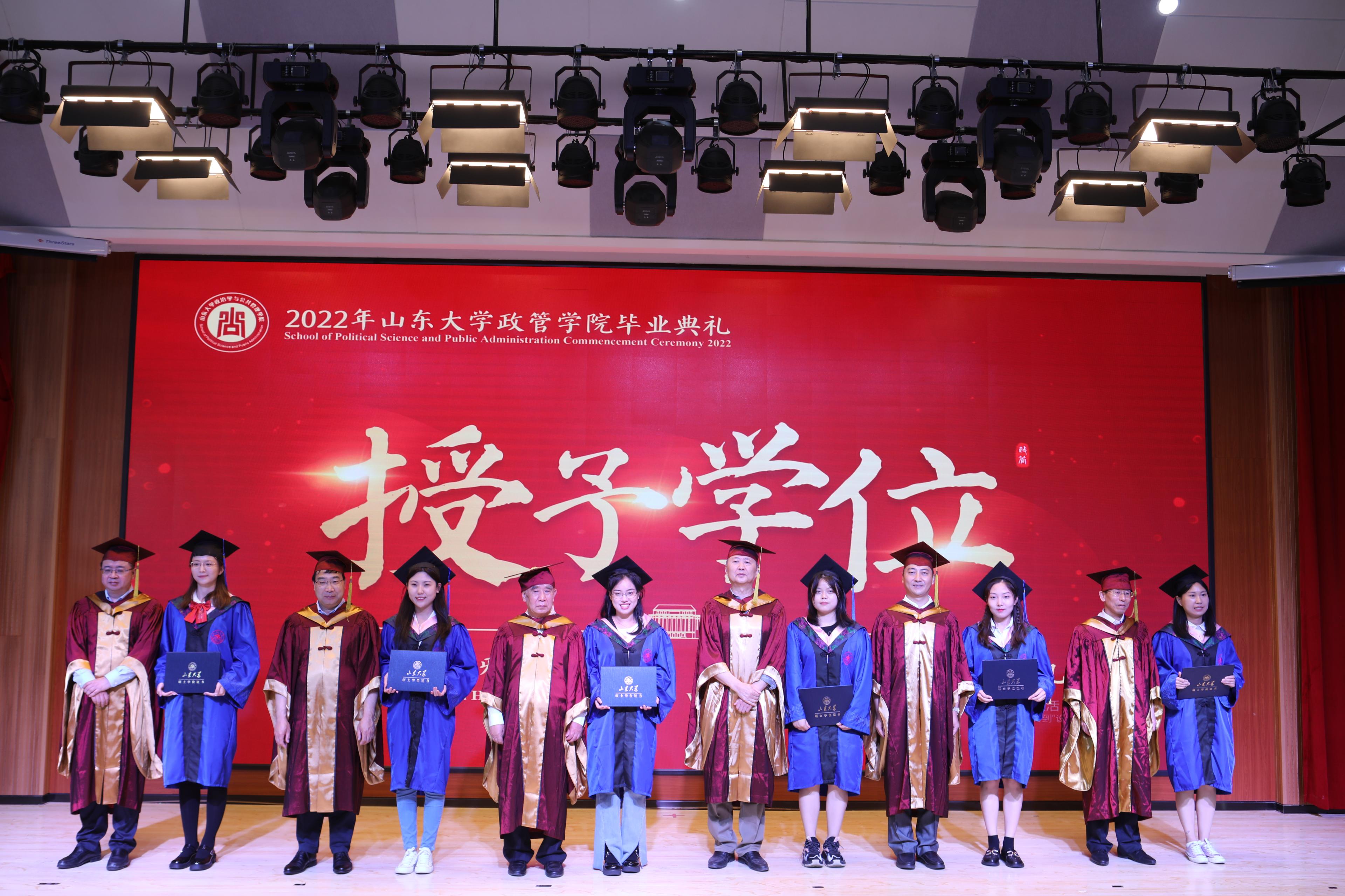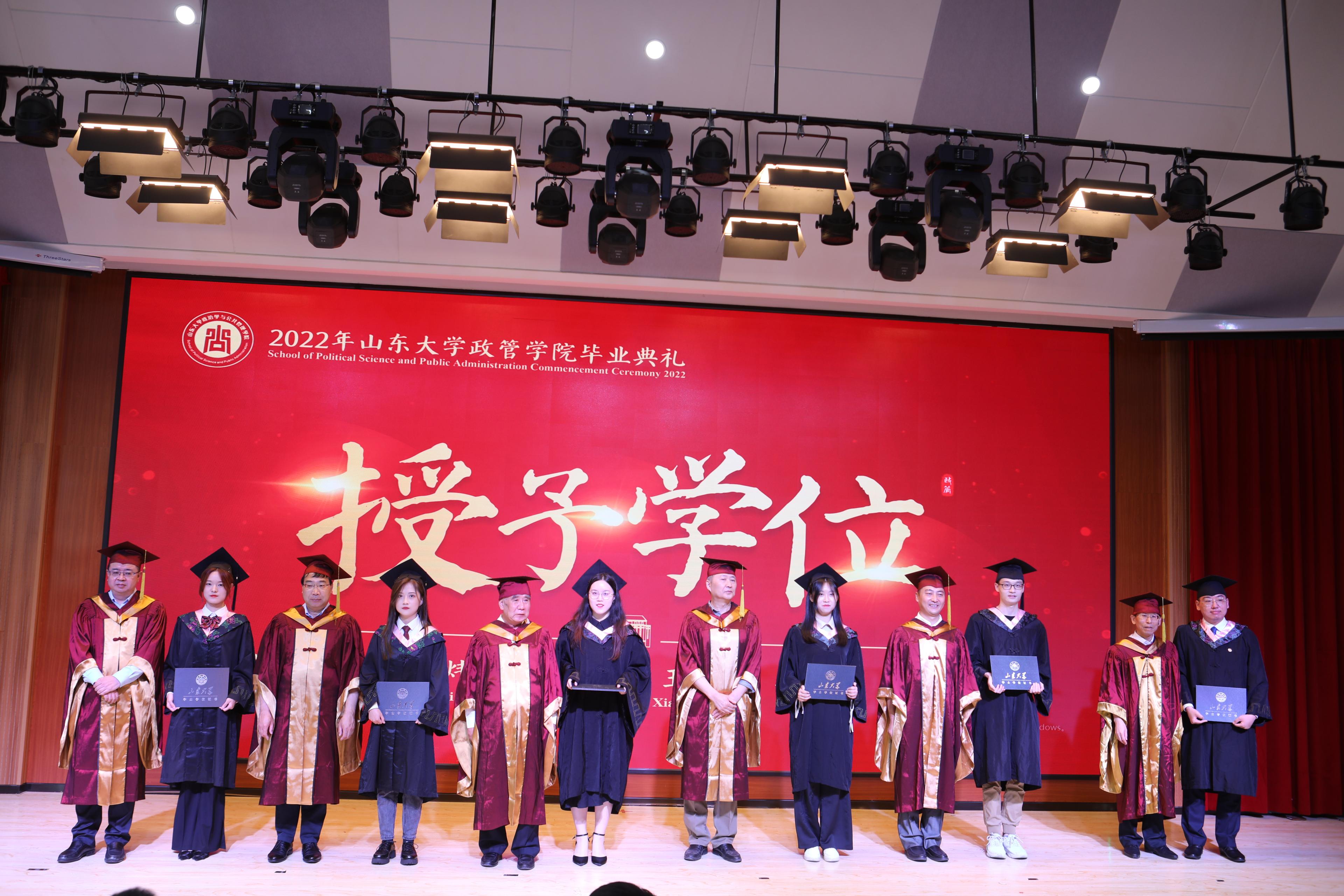 在学位授予仪式环节,政管学院学位评定委员会委员马奔教授、刘玉安教授、王建民教授、刘昌明教授、孔新峰教授、黄登学教授为毕业生授予了学位证和毕业证。最后,伴随着悠扬的山大校歌,本次毕业典礼暨学位授予仪式圆满完成。