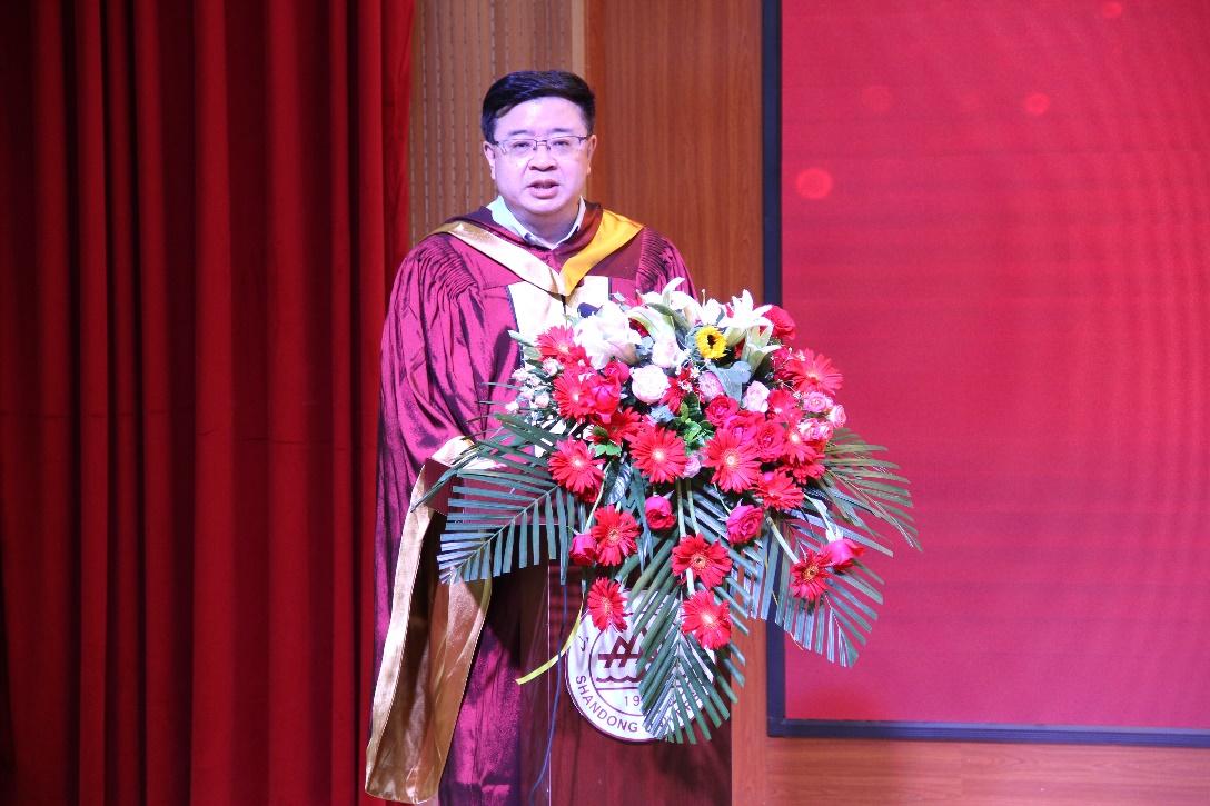 典礼在嘹亮雄壮的国歌中拉开帷幕。王之夏同学代表政管学院院长贝淡宁寄语全体毕业生。贝淡宁院长首先对顺利毕业的学子们表示祝贺。他充分肯定了同学们拼搏奋进、积极进取的精神,并对毕业学子们提出三点期望:第一,对工作要认真严谨,作为山大的一份子,作为政管学院的一员,努力展现自己的光华。第二,多花费心力关注爱的人。快乐的真谛不仅在于充实的工作,更在于多花费时间陪伴爱的人,包括父母、亲人、爱人、朋友等,有了爱的陪伴,生命才能充实。第三,保持谦逊的学习态度,希望学子们迈出校园后不要停下继续学习的脚步,待人接物更要平和谦逊,多学习别人的优点,多反省自身的缺点,才能形成自身对世界的整全认识。