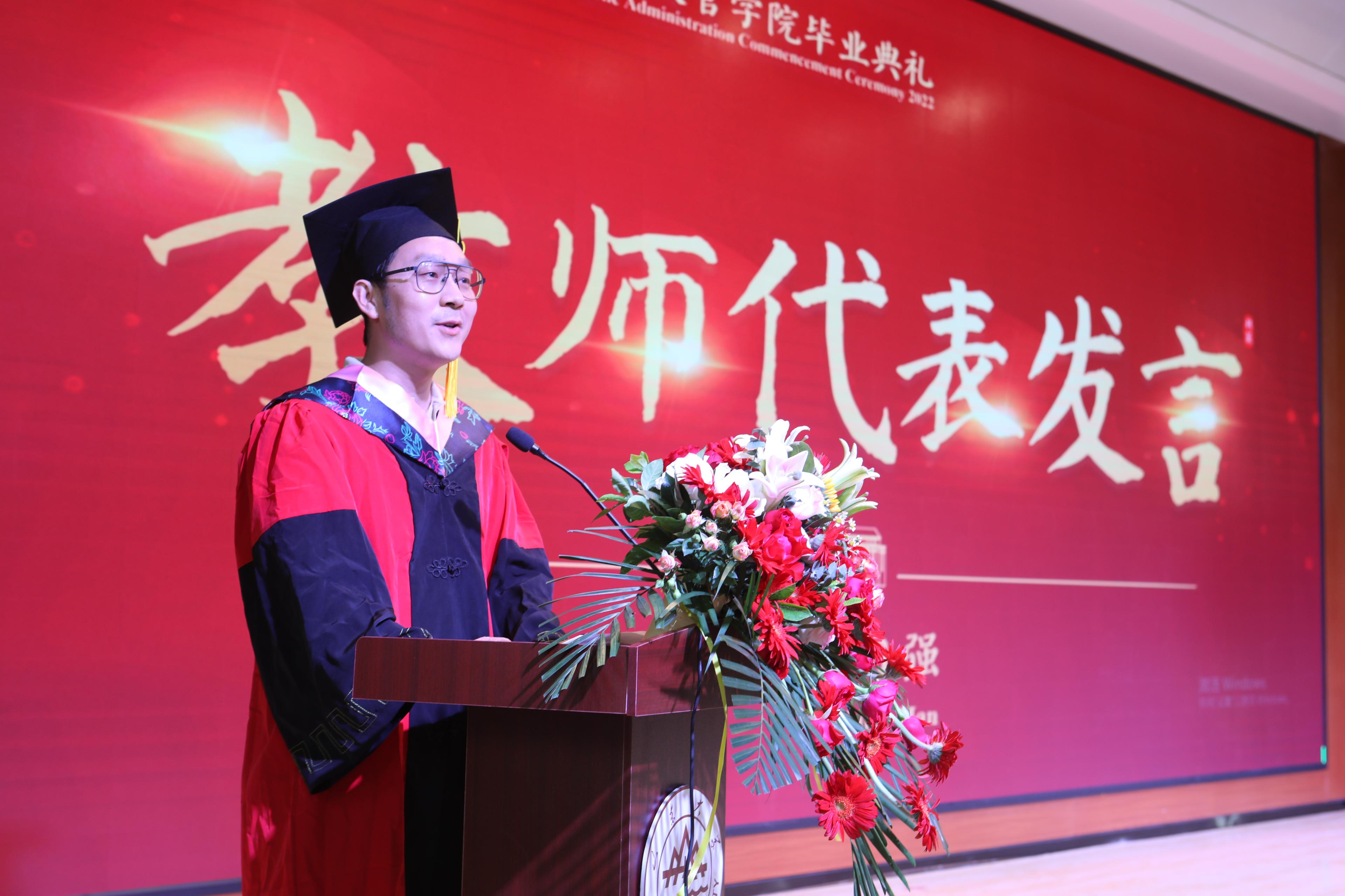 接下来,政管学院常务副院长马奔在致辞中表达了对同学们顺利毕业的祝贺与殷切期望,鼓励同学们要在立身、立业、立命的过程中磨练心智,培养自己的赤子之心、感恩之心、责任之心、宽恕之心、幽默之心,既要有温暖的心灵,也要有冷静的头脑,做到“心脑相通”,创造个人价值和社会价值。同时,马奔副院长希望同学们能够在百年未有之大变局中,征程新时代,奋力新作为,不负韶华,砥砺远行,知政为公,厚德笃行,磨练“五心”,快乐前行,并希望同学们能够走出一条绚烂如花的人生之路。