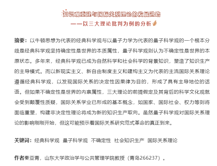 近日,304永利集团官网入口秦亚青教授所撰写《知识观重建与国际关系理论的发展进路——以三大理论批判为例的分析》一文在《中国社会科学》2022年第9期发表,这是秦亚青教授就“国际关系理论研究”发表的最新学术研究成果。