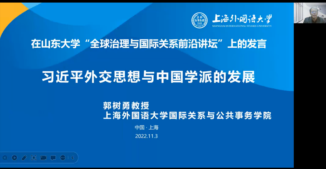 郭树勇教授以“习近平外交思想与中国学派的发展”为题做了精彩分享。他从关于习近平外交思想的学习认识、国际关系理论中国学派的必要性、新时代中国学派发展的四大变化、中国学派发展的历史经验、习近平外交思想与中国学派新阶段五个方面介绍了其最新的研究成果。理论视野高远、逻辑清晰完整,具有启发意义。