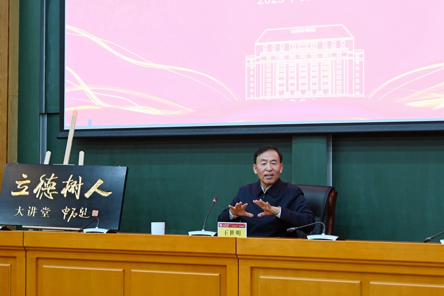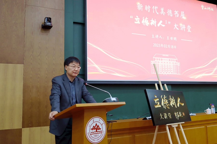 随后,鳌山讲坛暨新时代美德书屋“立德树人”大讲堂开讲。王世明以“学习贯彻党的二十大精神——中国式现代化的文化解读”为题作报告。他聚焦习近平总书记在学习贯彻党的二十大精神研讨班开班式上的重要讲话,从源泉、本质、特征、要求、安排、状态和遵循等七个方面对中国式现代化的概念和内涵进行了深入阐释,表示这一提法展示了强大的中国自信,彰显出中国人的力量和底气。他援引《易经》《道德经》《论语》《孟子》等多部中华元典中的经典语句,阐明中国式现代化是中华文明的智慧结晶,习近平新时代中国特色社会主义思想是中华文化和中国精神的时代精华。他强调,要坚定历史自信、文化自信,坚持中国特色社会主义文化发展道路,深入学习贯彻习近平新时代中国特色社会主义思想和党的二十大精神,以教育现代化推动实现中国式现代化。