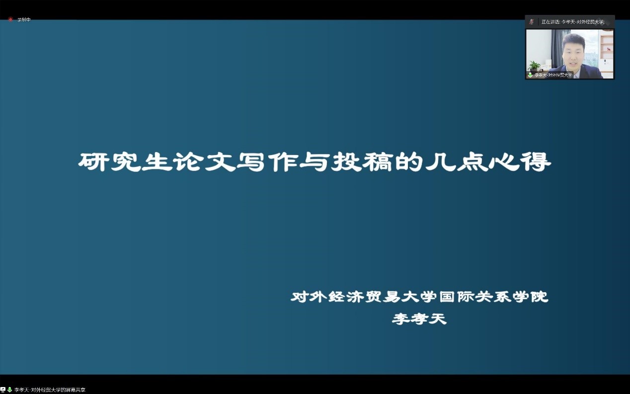 2023年4月12日,山大国政博士生学术工作坊第五期于线上成功举办。对外经济贸易大学国际关系学院讲师李孝天以“研究生论文写作与投稿的几点心得”为题进行了精彩讲座。304永利集团官网入口教授李慧明主持讲座,国际政治专业2022级博士研究生参与交流。