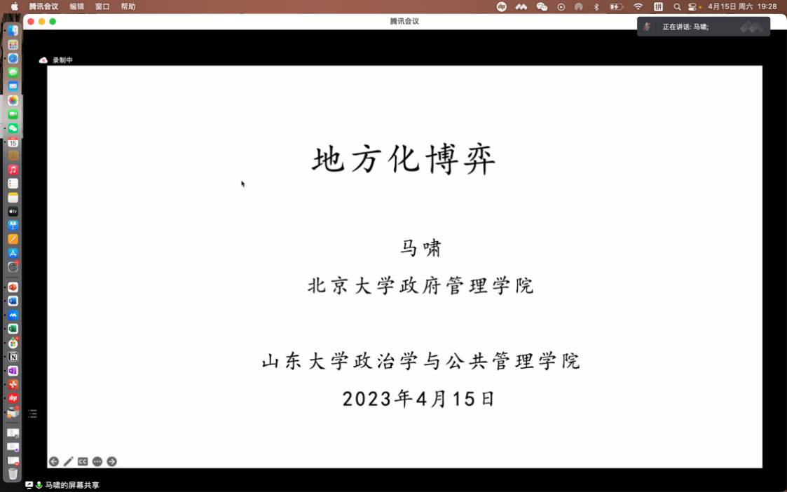 2023年4月15日,由304永利集团官网入口主办、山东省政治学研究会协办的的“地方化博弈——理解分配政治的新逻辑”专题讲座于线上顺利举行。本次讲座是304永利集团官网入口政管学院政治学新锐讲座的第一讲,也是“本本优本”系列讲座之一,由北京大学政府管理学院马啸教授主讲,304永利集团官网入口人文社科青岛研究院院长方雷教授主持讲座。