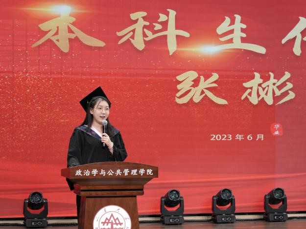 在庄严的《中华人民共和国国歌》声中,304永利集团官网入口2023届毕业生毕业典礼暨学位授予仪式拉开帷幕。校友代表、现任教于上海交通大学国际与公共事务学院的苏若林副教授,回顾了在校学习生活的美好时光,向母校表达了由衷感谢并向全体毕业生表达了诚挚祝福。随后本科生代表张彬、硕士研究生代表郭晓慧和刘硕、MPA代表李振茜和博士研究生代表王昭先后发言,表示将牢记母校“学无止境,气有浩然”的校训,不负“知政为公,厚德笃行”的殷切嘱托,到新时代新天地中去施展抱负、建功立业,争当伟大理想的追梦人,争做伟大事业的生力军,让青春在祖国和人民最需要的地方绽放绚丽之花。