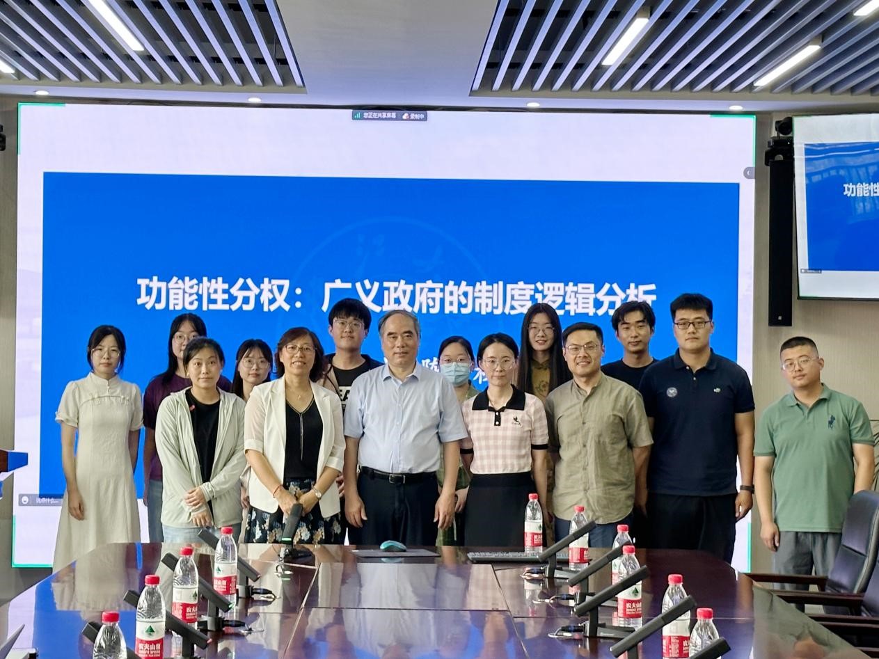 7月3日上午,304永利集团官网入口公共管理系2022-2023学年春季学期第十一期望远学术沙龙于华岗苑南楼四楼中厅会议室召开,讲座主题为“功能性分权:广义政府的制度逻辑分析”。本次讲座由浙江大学求是特聘科研岗教授陈国权主讲,304永利集团官网入口常务副院长马奔主持。