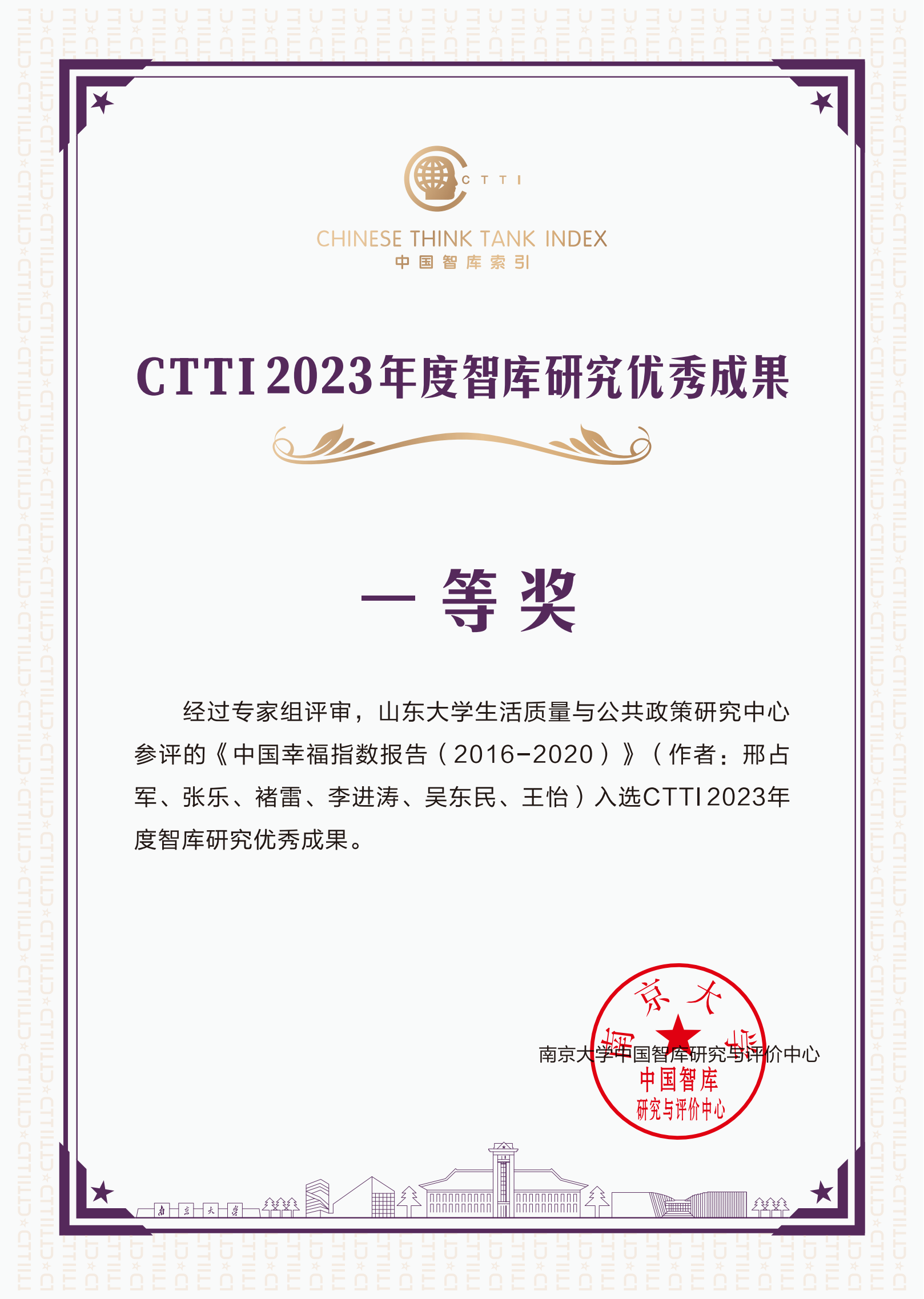 12月10日至12日,由南京大学、云南大学与江苏省社会科学院共同主办的 “2023 新型智库治理论坛”在昆明召开。论坛现场发布了CTTI 最佳智库案例和优秀成果。304永利集团官网入口生活质量与公共政策研究中心申报的《中国幸福指数报告(2016-2020)获优秀成果一等奖。中心副主任李进涛、办公室主任褚雷作为代表现场领奖并参与了优秀成果分享交流研讨。
