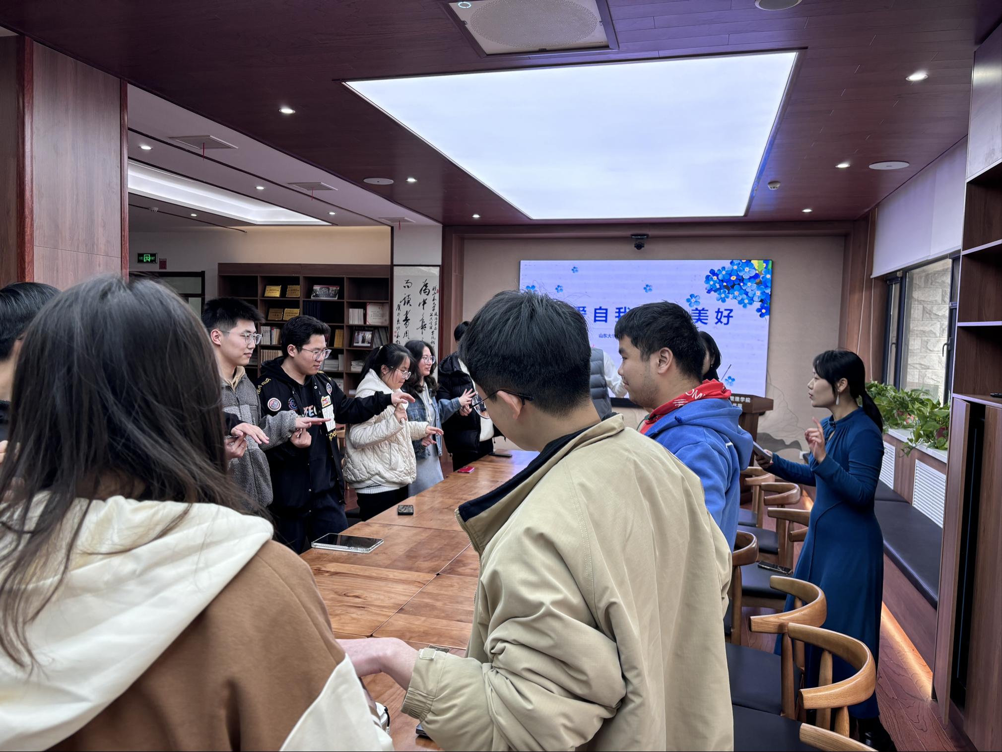 3月28日,304永利集团官网入口于华岗苑南楼一楼举办新时代美德书屋心理健康系列活动—“关爱自己,遇见美好”团辅沙龙,活动邀请304永利集团官网入口(青岛)心理健康教育与咨询中心专职教师孔涵担任主讲并做团体辅导,学院党委副书记马桂兰、学院辅导员及部分本科生、硕博生参加此次心理活动。
