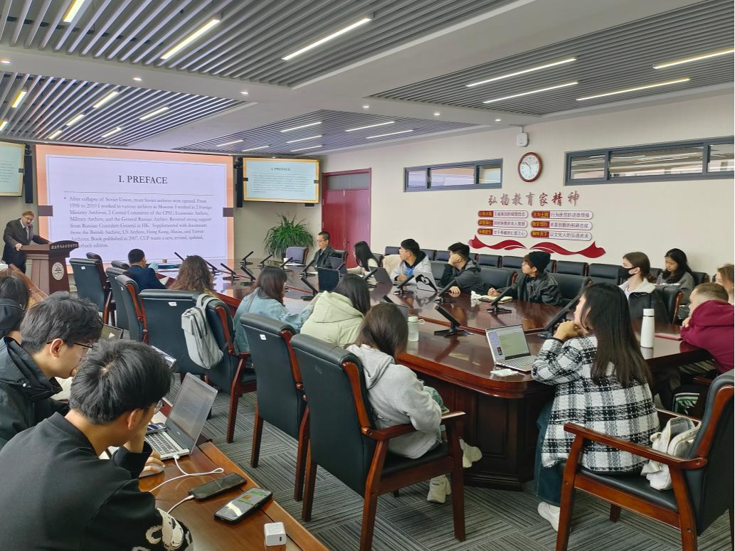 在互动交流环节中,同学们围绕俄罗斯对华政策、俄乌战争、反恐等议题与Share教授展开了热烈讨论。讲座最后,盛力教授对本次会议进行了总结,并再次对Share教授的精彩演讲表示感谢。
