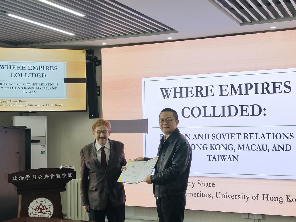 讲座伊始,Share教授讲述了自己与这项研究结缘的相关工作经历,特别是长达15年担任俄罗斯中心主任和顾问,之后系统梳理了19世纪晚期以来苏联/俄罗斯与中国香港、澳门、台湾地区之间的关系变迁和政策演变,揭示了苏联/俄罗斯与这些地区的互动与中国、英国、日本、美国之间广泛复杂的国际关系密切相关。盛力教授认为Share教授的研究对当今如何深化俄罗斯与中国在粤港澳大湾区的合作极具启发意义。