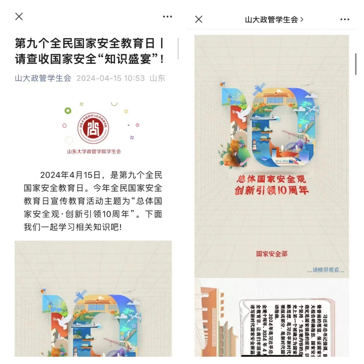 2024年是习近平总书记提出总体国家安全观10周年,4月15日迎来了第九个全民国家安全教育日。为深入贯彻落实习近平总书记关于加强国家安全教育的重要指示批示精神,政管学院坚持安全底线思维,围绕加强安全部署、防范安全隐患、加强安全教育等方面,不断完善安全工作体制机制,多管齐下、多措并举扎实推进学校国家安全教育活动。