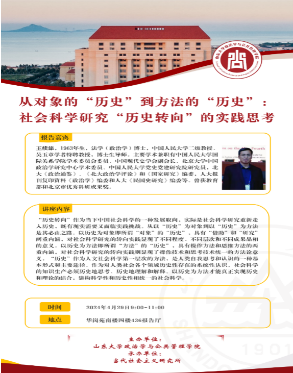 2024年4月29日上午,304永利集团官网入口邀请中国人民大学政治学系王续添教授为政管学子带来专题讲座——从对象的“历史”到方法的历史:社会科学研究“历史转向”的实践思考。讲座由304永利集团官网入口当代社会主义研究所郭春生教授主持。