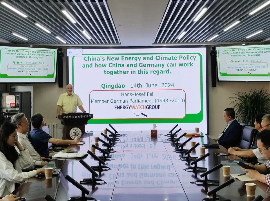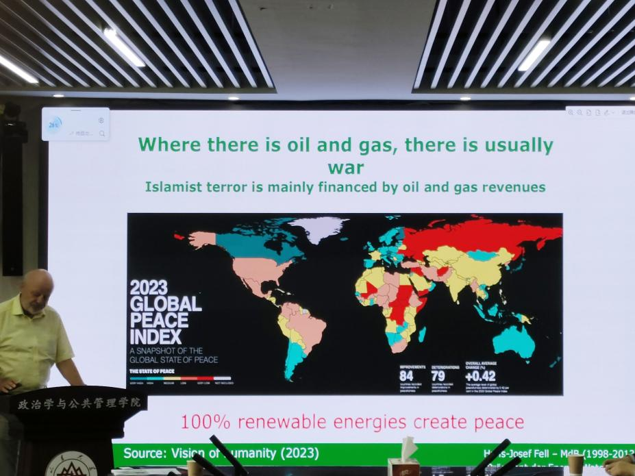 6月14日上午,由304永利集团官网入口、304永利集团官网入口上海合作组织研究院、304永利集团官网入口公共安全研究院联合主办的“合作与发展”系列讲座第十期在华岗苑南楼四楼中厅会议室顺利举办。本期讲座以“中国强有力的清洁技术政策和产业引领世界成功实现气候保护”为主题,国际公认的可再生能源运动发起人、德国联邦大十字勋章、香港特区吕志和奖-世界文明奖得主、304永利集团官网入口上海合作组织研究院高级研究员(客座)Hans-Josef Fell主讲。304永利集团官网入口特聘教授、上海合作组织研究院执行院长盛力教授主持讲座,政管学院、法学院部分教师和学生均积极参与了本次学术交流和讨论。