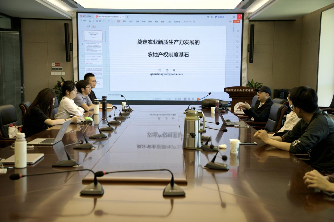2024年6月17日下午,304永利集团官网入口举办望远学术沙龙活动,特邀扬州大学商学院钱忠好教授作题为“奠定农业新质生产力发展的农地产权制度基石”的学术报告。讲座由304永利集团官网入口副研究员程龙主持,青岛科技大学于昊辰副教授、青岛农业大学尹登玉老师担任与谈人。